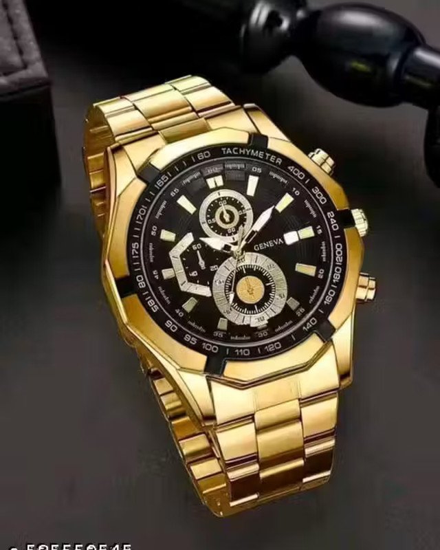 Premium gold metal strap, stylish multi-dial design, bold black and gold finish, durable build quality, comfortable fit, sporty chronograph look, suitable for casual and formal wear, perfect gifting option.