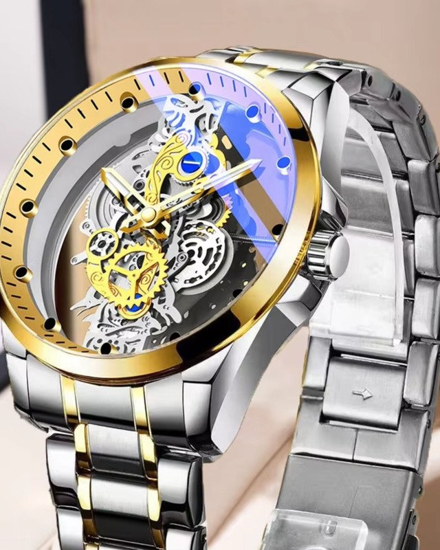 Skeleton-style transparent dial, two-tone gold and silver finish, durable stainless steel strap, mechanical-inspired design, comfortable and secure fit, premium luxury appearance, suitable for casual and formal wear, perfect gifting option.