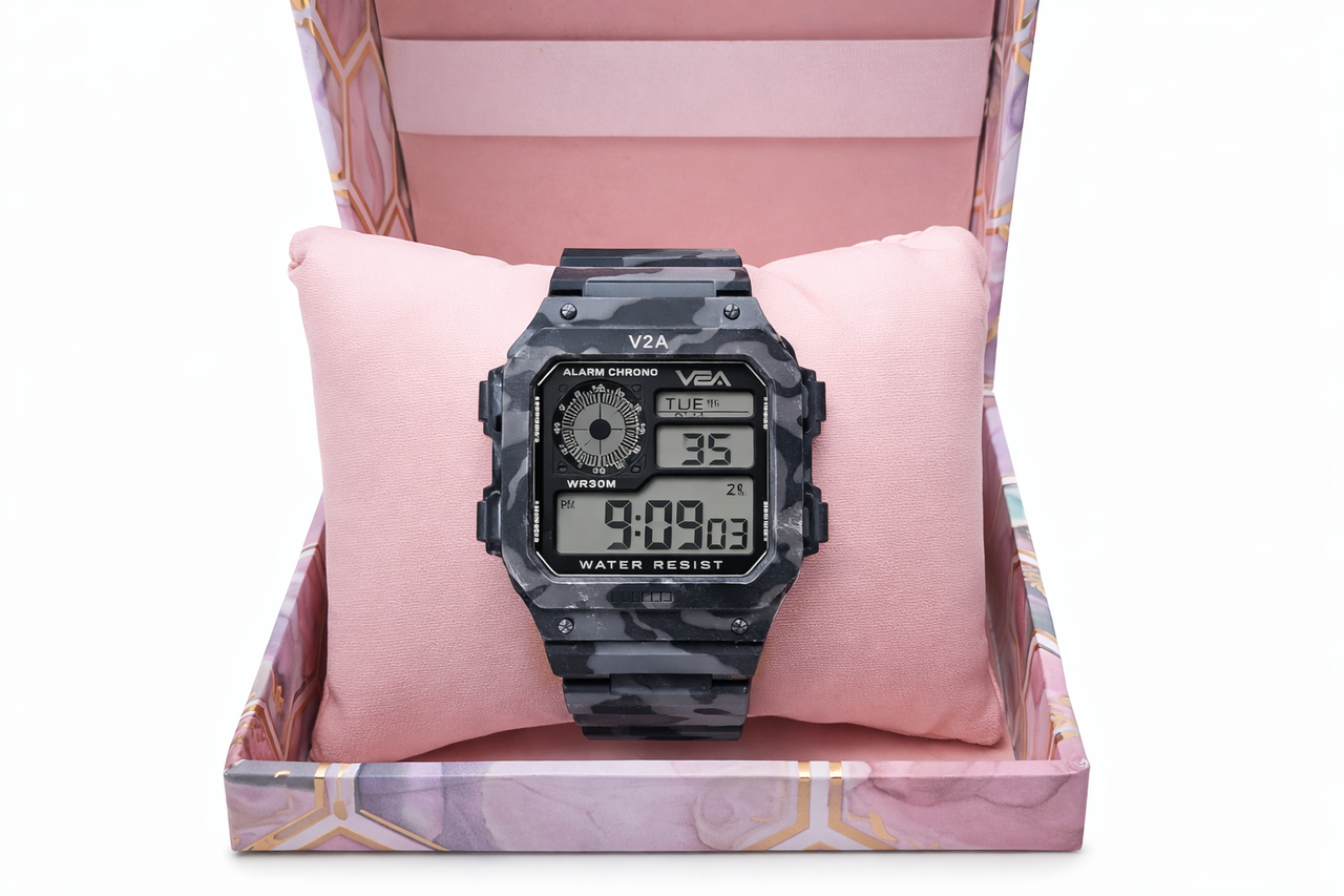 Rugged digital sports watch featuring a camouflage design with clear digital time, day, and date display. Built for active lifestyles, it includes alarm, stopwatch functions, and water-resistant construction, making it ideal for sports, outdoor activities, gym, and daily casual wear.